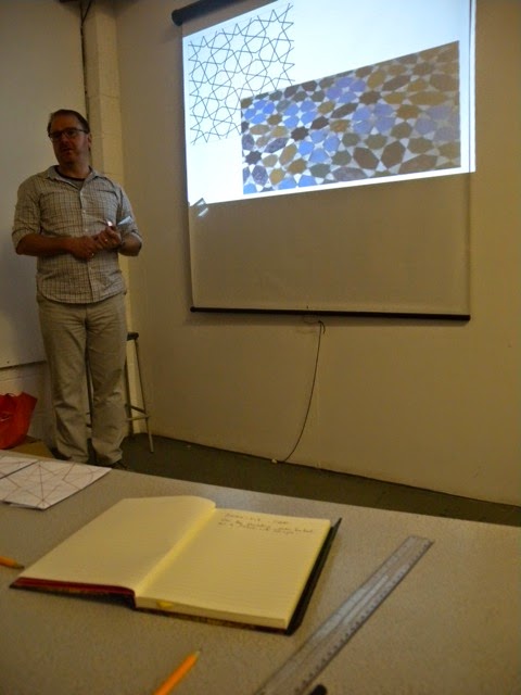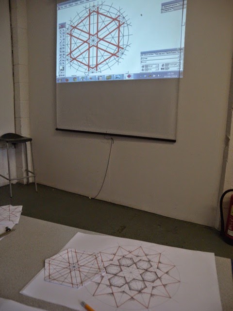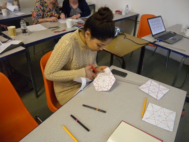 Habiba and I spent the day at Northlight Studio in Hebden Bridge taking part in the Islamic Geometric Design workshop led by Eric Broug. Eric is the author of a Thames & Hudson book with the same title as our workshop session, and it was an excellent introduction to the subject. Enjoyable and informative, Eric gave us an overview, and then followed up with practical sessions is which we all created several versions of Islamic designs.