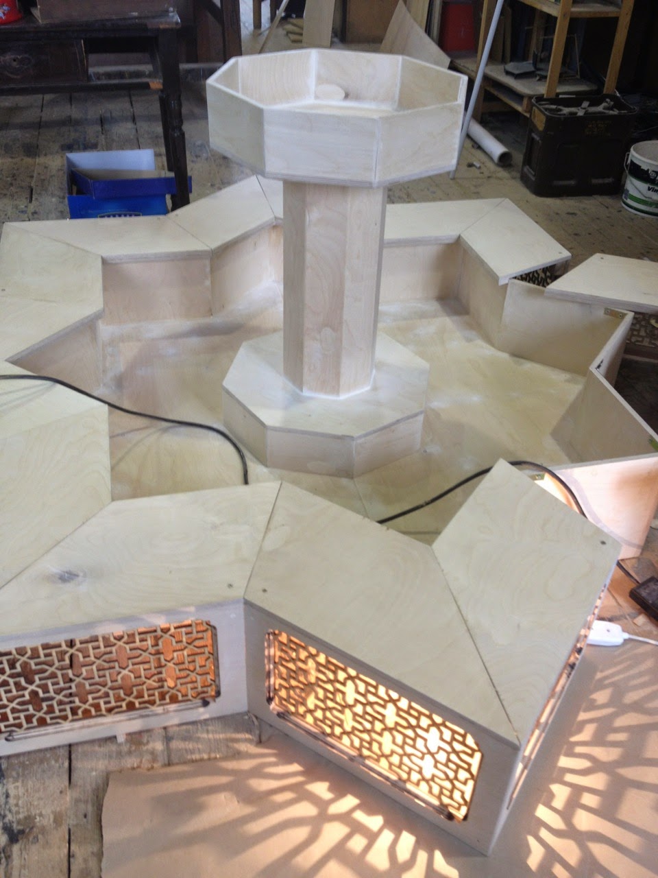 Phil Milston is making progress with the fountain - yesterday he trialled putting lights into the lower star-shaped wall. This is going to be one of the centre-pieces for the Whitaker exhibition, which opens on November 15th.
